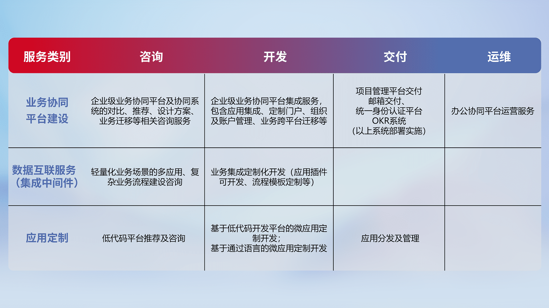 针对钉钉、、企微、、、、IDaas等平台级产品提供产品的规划、、方案、、交付、、定制化开发等服务,,,,实现如统一协同办公、、、、智能客户服务、、、混合会议管理、、、、智能数据查询、、、等业务场景,,,实现数字化转型。。。